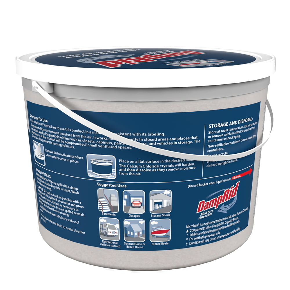 About this itemProduct detailsDampRid Hi-Capacity Moisture Absorber Bucket is your mess free odor eliminating solution for large areas where excess moisture and stagnant air is a problem.  Does your basement or laundry room often seem damp and musty? DampRid gets rid of dampness and creates noticeably cleaner, fresher air.  To use, simply remove the plastic lid exposing the sealed safety cover. DampRid goes to work instantly, attracting and trapping excess moisture out of the air. This item is fragrance free. DampRid Hi-Capacity Moisture Absorber Bucket attracts and traps excess moisture, eliminating musty odors from damp areas. Ideal for larger spaces like basements, garages, where stagnant air and excess moisture is a problem. DampRid attracts excess moisture from the air, trapping it inside the bucket and leaving rooms feeling and smelling fresher. To use, remove the plastic lid exposing the sealed safety cover. Discard once the moisture absorbing crystals have fully dissolved. error:We aim to show you accurate product information. Manufacturers, suppliers and others provide what you see here, and we have not verified it.  See our disclaimer